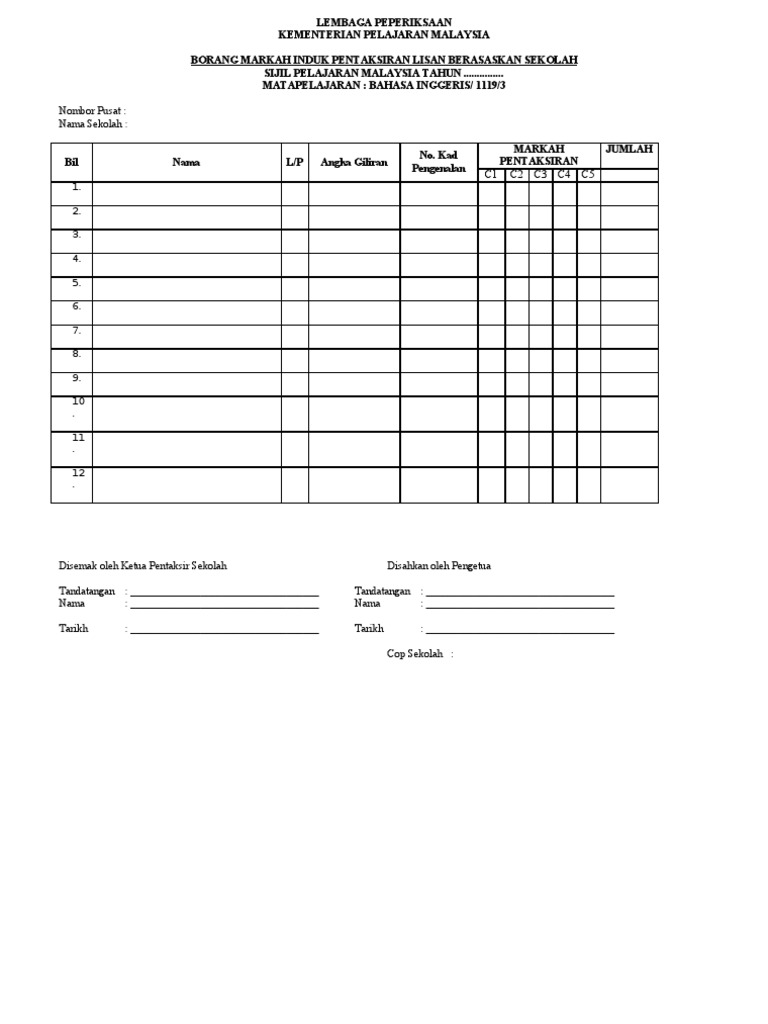 Borang markah induk ujian lisan berasaskan sekolah sijil pelajaran malaysia bahasa melayu tahun.