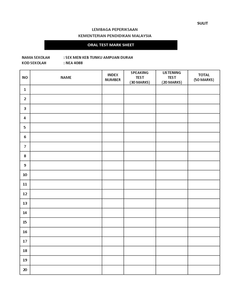 Smk taman sejati muda bea 3016 angka giliran ujian bertutur 30 markah ujian mendengar 20 markah jumlah 50 markah abdul 1 rani bin aziz xxxxx 24 15 39 mahirah 2 binti ismail xxxxx 27 20 47 ng 3. 60 borang markah ujian lisan mendengar 24. Interested in flipbooks about Ujian Lisan SPM Bahasa Inggeris.