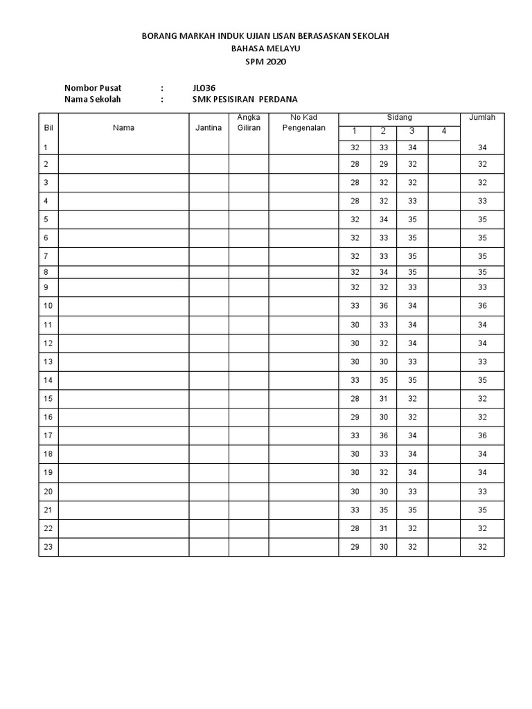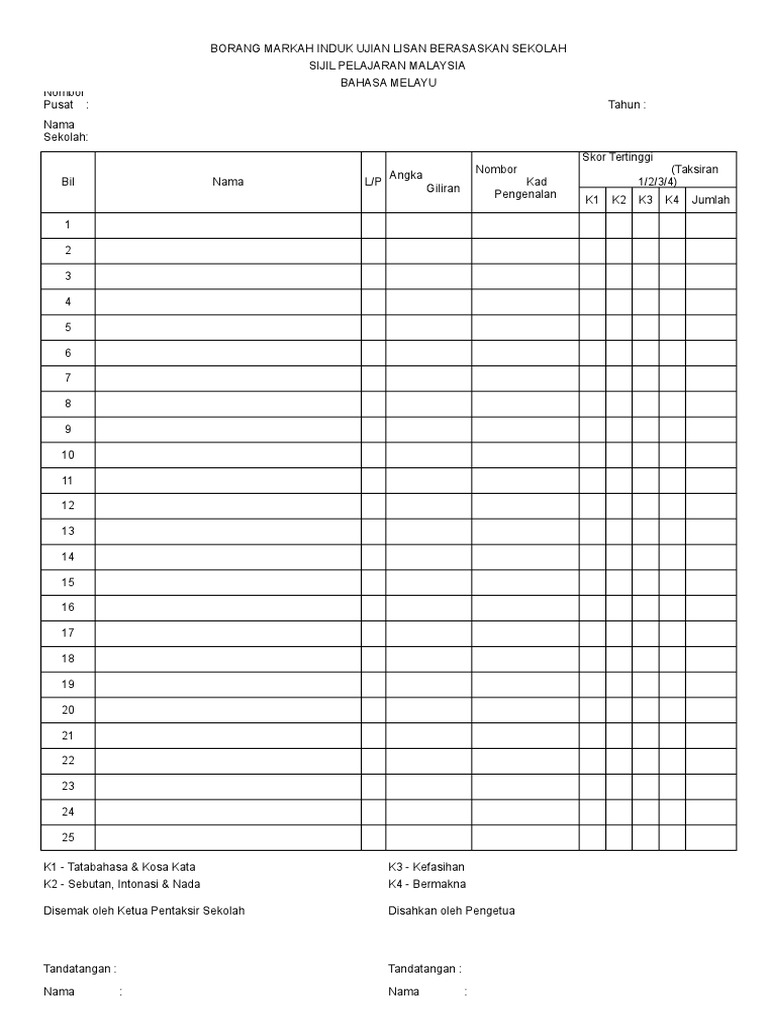 Borang markah induk ujian lisan berasaskan sekolah bahasa melayu. BORANG MARKAH INDIVIDU. Mulai tahun 2021 peperiksaan Sijil Pelajaran Malaysia SPM bagi mata pelajaran Bahasa Melayu akan menggunakan format baharu.